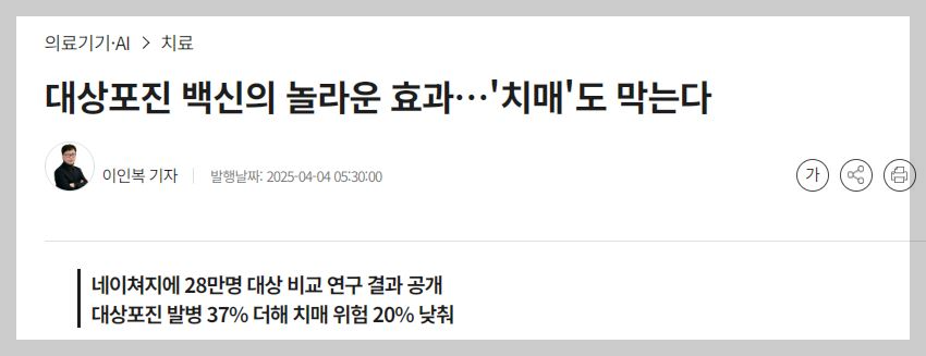 최근 기사에 (25.05.14) 대상포진 백신이 심혈관 질환 예방 효과가 있다는 연구 결과가 발표되었다고 났는데요, 대상포진을 예방하기 위한 주사에 이런 효과까지 있다니 놀랍습니다.
